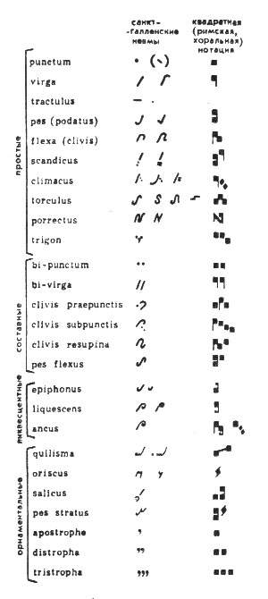 Невмы (ср.-век. лат., ед. ч. neuma, от греч. - дыхание) - 1) знаки нотации (первоначально. безлииейной), применявшиеся в Европе в средние века и позднее для записи церковной музыки. Невмы произошли, предположительно, от обозначений греческих речевых акцентов, знаков пунктуации или хейрономии. Невмы служили певцам напоминанием уже известных напевов, фиксировали общие контуры движения мелодии. Сходные с невменной системы нотации существовали в древних культурах Египта, Индии, Палестины, Сирии, Персии, Армении (см. хазы) и др. Первые памятники западноевропейской невменной нотации датируются 9 веком. Её основные разновидности-санкт-галленская, аквитанская, лотарингская (мецская), беневентанская, мозарабская, англосаксонская. Невмы могут быть классифицированы по количеству знаков в одном начертании и способу исполнения: простые, составные (из двух или нескольких простых), ликвесцентные (для облегчения исполнения артикуляционно-трудных слов), орнаментальные: